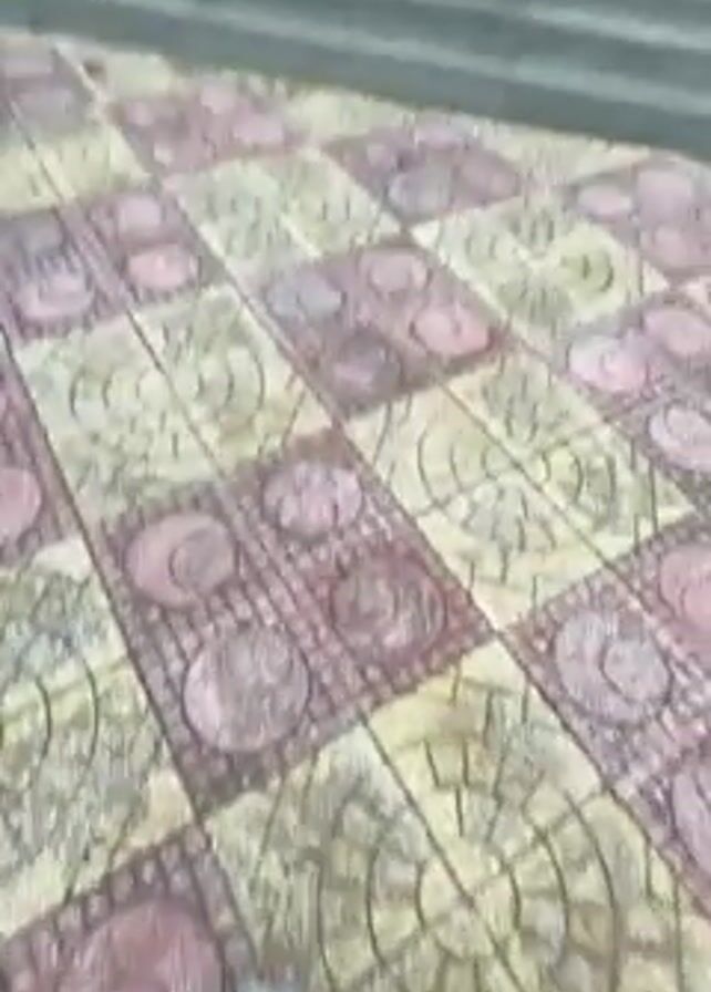 person walking towards a monument at the top of a set of gray stairs. The person is wearing black pants and light blue slide sandals. The ground is made of patterned gray, white, and pink tiles. As the camera pans up, the stairs come into view. At the top of the stairs is a white monument flanked by the Russian flag on the left and the Vietnamese flag on the right. The sky is overcast.