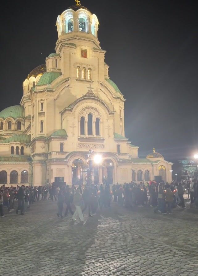 large group of people gathered at night in front of a large, ornate cathedral. The cathedral is brightly lit and has multiple domes. The people are holding candles, suggesting a religious procession or vigil. The ground is paved with cobblestones, and there are some streetlights visible in the background. The overall atmosphere appears solemn and reverent.