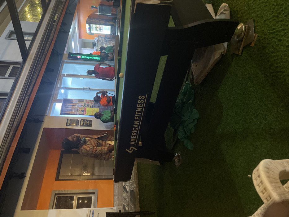 A billiard table labeled "American Fitness" sits on artificial turf. A man in a plaid shirt stands beside the table, seemingly outside a building with people visible through the glass windows and doors. Inside, people wearing colored shirts are present. A Heineken sign is also visible. A white wicker chair is partially visible in the lower right corner.
