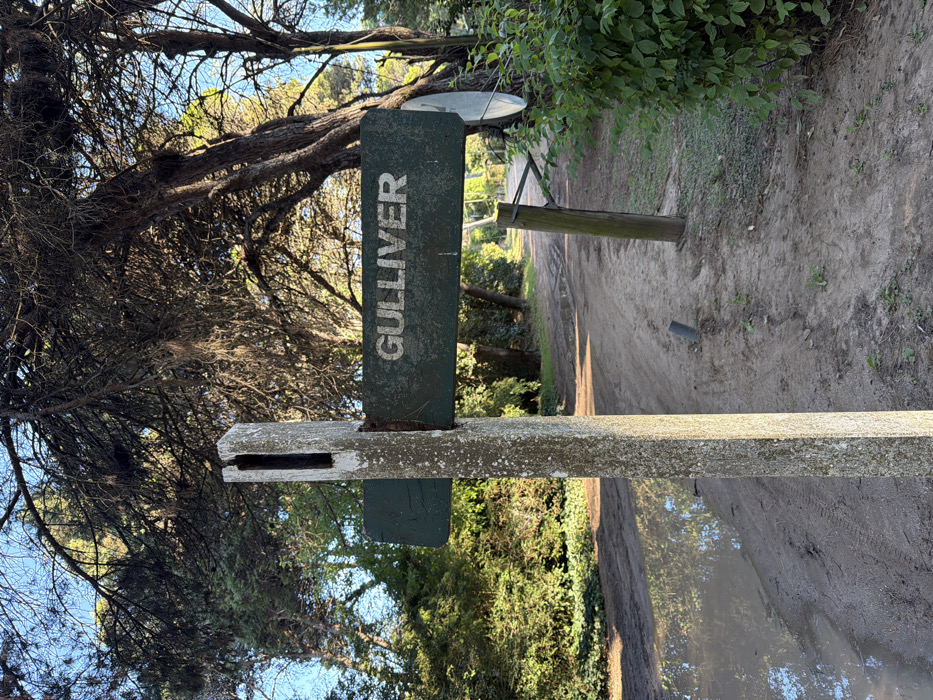 An aged wooden signpost with a dark green rectangular sign displaying the faded white capital letters "GULLIVER" is centrally positioned
