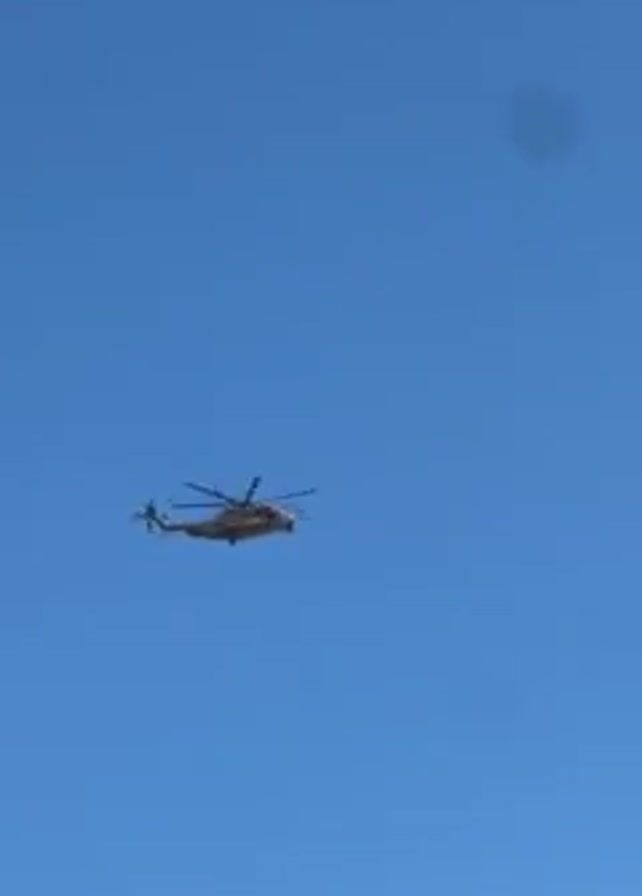 helicopter flying in the sky. The sky is clear and blue. The helicopter is a dark, camouflaged color.