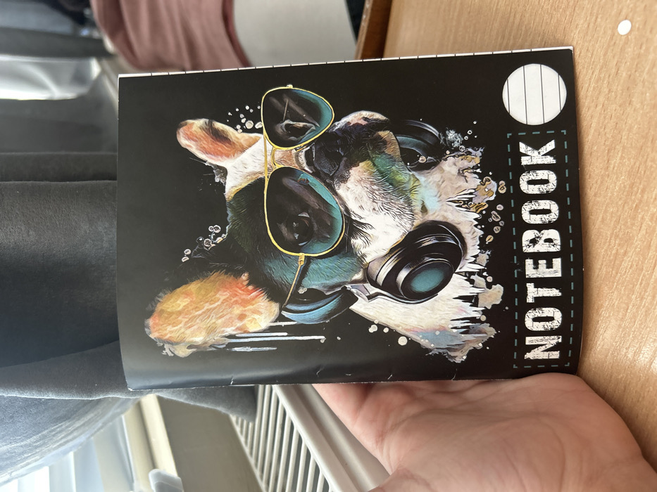 The image depicts an interior scene within the city of Haskovo, Bulgaria. A left hand, consistent with that of an adult, is holding a standard A5-sized notebook vertically. The notebook features a glossy black cover with a stylized, colorful illustration of a French bulldog. The dog is depicted wearing gold-framed aviator sunglasses with teal lenses and black over-ear headphones with teal accents. The illustration incorporates paint-splatter and drip effects in white, teal, yellow, and orange around the dog's head. Below the illustration, the word "NOTEBOOK" is printed in a white, stencil-style font with a dotted outline, next to a white circular space containing horizontal lines. The notebook's spine exhibits minor creases from handling. The background on the left reveals a white window sill and a white finned radiator, with ambient natural light entering from a window. Dark grey fabric, likely curtains, is visible in the upper-left background. The notebook is positioned partially over a light brown wooden surface, possibly a desk or table. A blurred reddish-pink fabric object is discernible in the upper-right background.