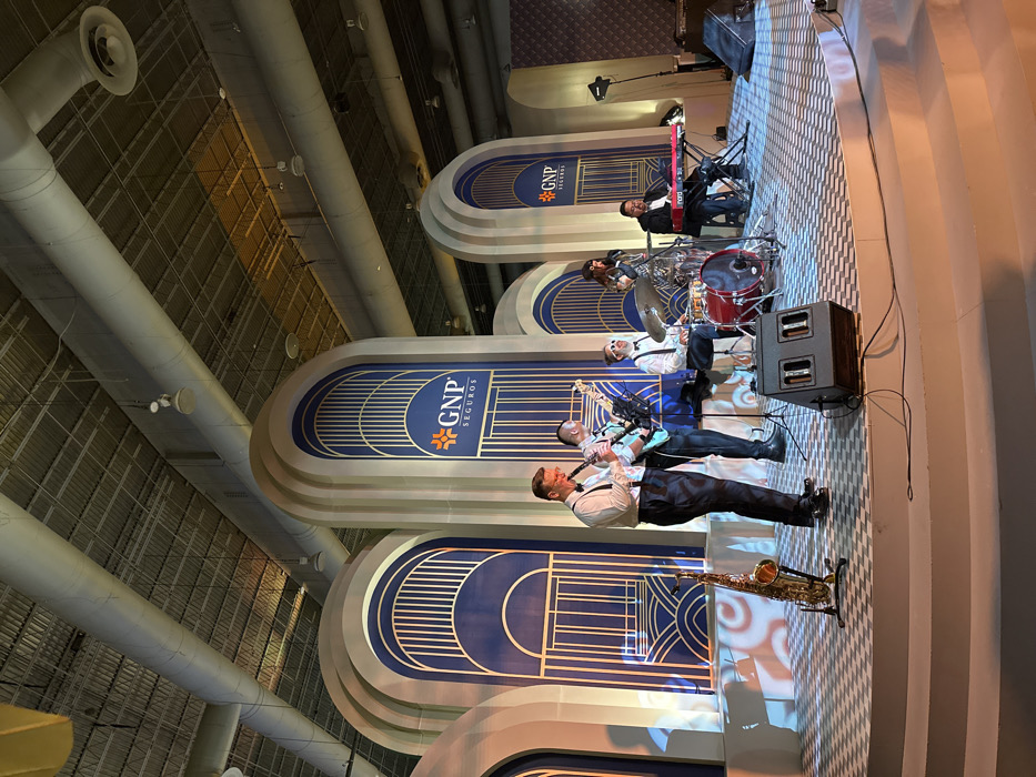 A jazz band performs on a stage with multiple, tiered platforms adorned with art deco-style blue and gold signage that reads "GNP Seguros