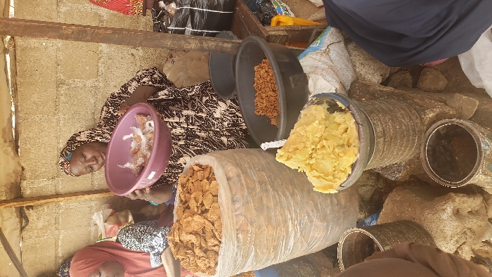 The image depicts an outdoor market stall in Sabon Tasha, Nigeria