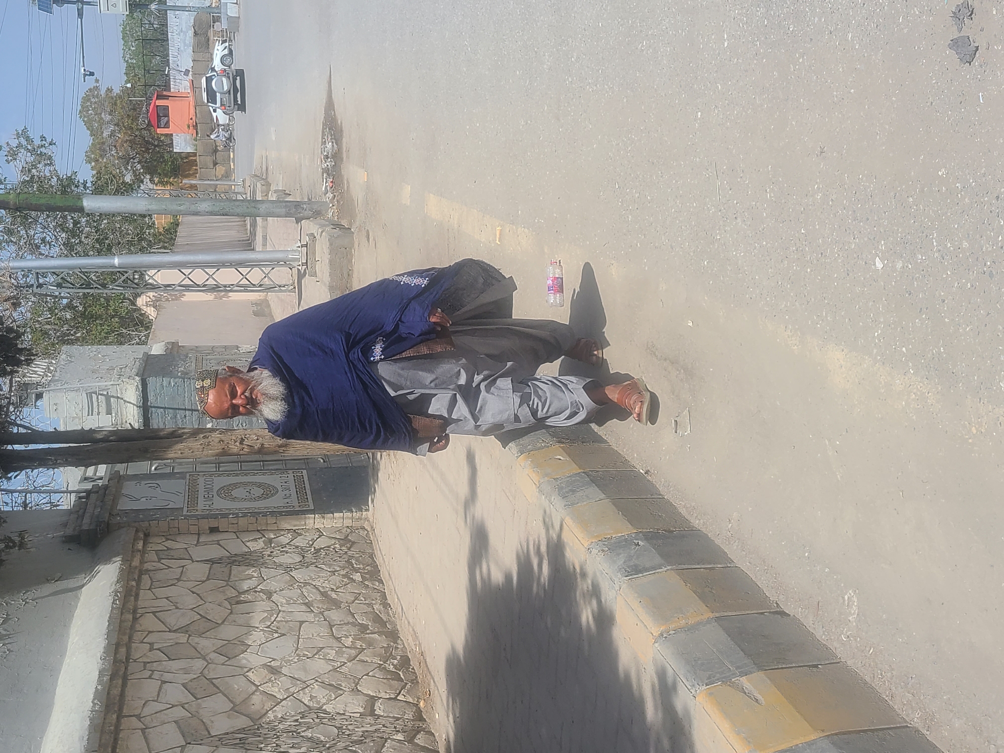 An elderly man with a long white beard wearing a dark blue top and gray pants is sitting on the sidewalk of a street in Quetta City Tehsil, Pakistan. A water bottle lies beside him on the street. The sidewalk is made of gray stone and has a yellow and gray curb. The street is light gray with a yellow line. A building with a stone facade stands to the left of the man, and trees and other buildings can be seen in the distance.
