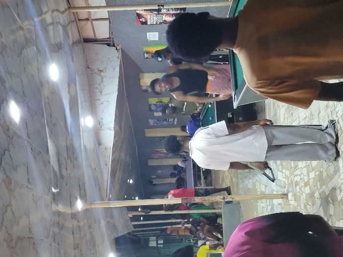 A bustling pool hall features multiple tables and players engaged in the game
