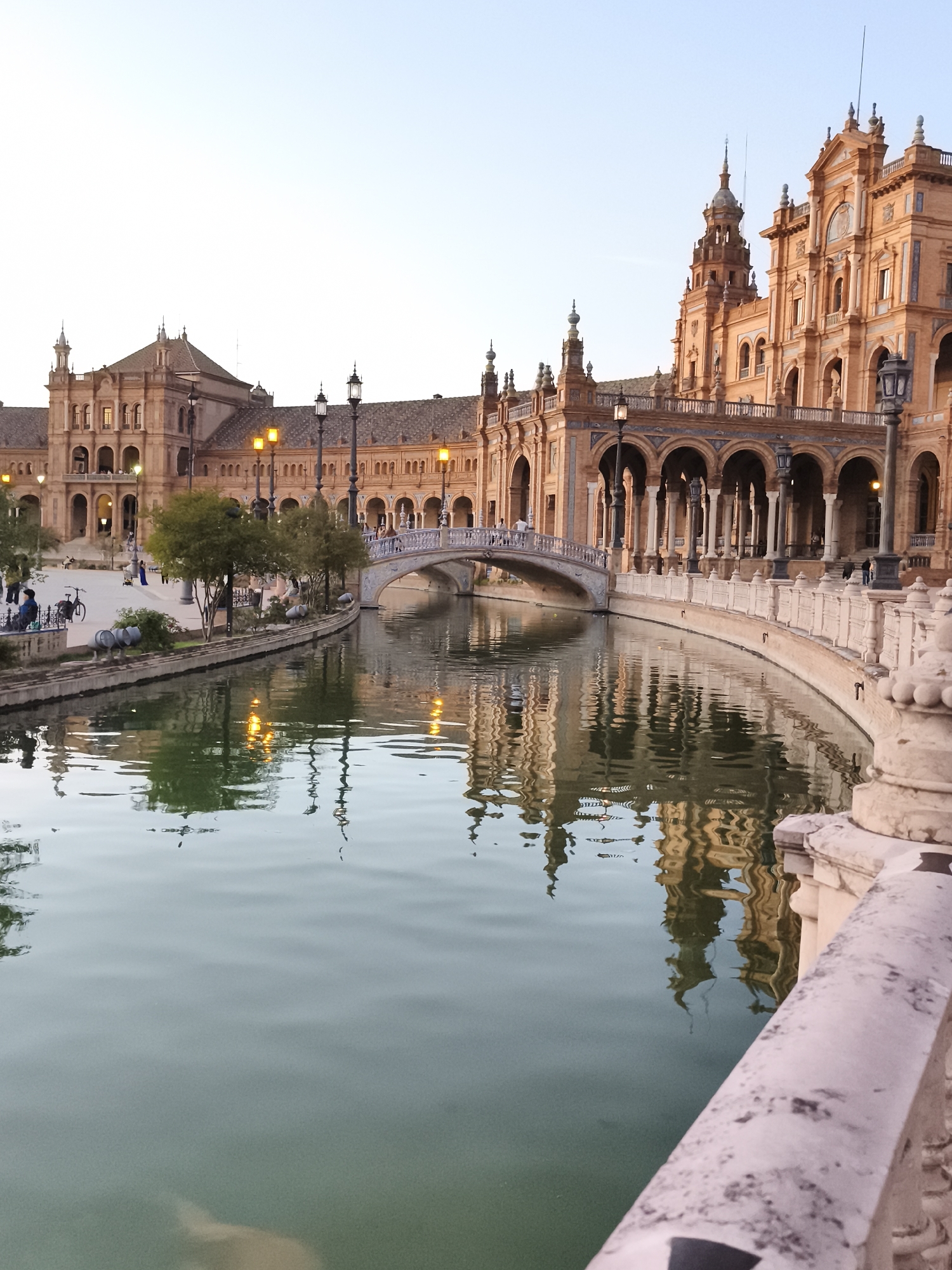 This image depicts the Plaza de España in Seville, Spain, at twilight. The scene is dominated by the semi-circular, multi-story building constructed of brick with stone accents, featuring extensive arched galleries, columns, ornate balconies, and distinctive towers, all characteristic of the Plaza de España's Moorish Revival and Renaissance Revival architecture. In the foreground and midground, a wide, calm canal with greenish-grey water reflects the illuminated building and streetlights. At least one ornate, light-colored stone bridge with a single arch and blue tiled details crosses the canal, connecting different sections of the plaza. Numerous classic-style streetlights with warm yellow illumination are active along the building's facade and the canal's banks, their light strongly reflected in the water. Several individuals are present, scattered across the plaza. Some are visible walking along the paths next to the canal and under the building's arches. A few people are standing or sitting, and at least two bicycles are parked near a railing on the left side of the canal path. Trees and small shrubs line the canal bank. A decorative, weathered stone balustrade is partially visible in the immediate bottom right foreground, indicating the vantage point. The sky above is a clear, light blue fading to white, consistent with dusk.
