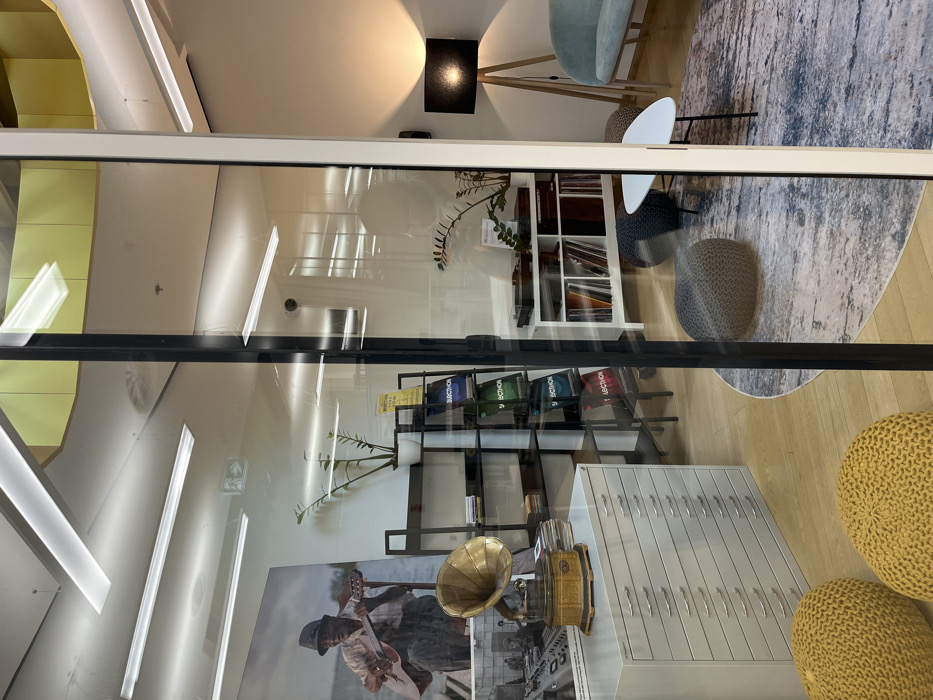This image depicts the interior of a music-themed retail or lounge space, specifically identified as Music Box Budapest, located at Király utca 20, 1061 Budapest, Hungary. The scene is viewed through a clear glass partition, evidenced by reflections of overhead fluorescent lights and a faint silhouette of a person in the mid-right. The environment features light-colored wooden flooring throughout, transitioning to a circular abstract patterned rug in tones of grey and blue in the right-hand lounge area. The ceiling is white with multiple linear fluorescent light fixtures and a segment of yellow acoustic paneling. On the left side of the interior, a large black and white poster displays an elderly man in a hat playing an acoustic guitar outdoors by a body of water. Below it, a white multi-drawer flat file cabinet is positioned. On top of this cabinet rests an antique brass and wood gramophone. To the right, a black metal shelving unit holds a potted plant and several "MUSICBOX" branded vinyl record sleeves displayed vertically, along with other items. The right side of the interior presents a lounge area. A white console table or low shelving unit holds a turntable and displays vinyl records within its compartments. A small potted plant is also on this unit. A light blue, curved armchair is positioned on the rug, adjacent to a modern floor lamp with a wooden tripod base and a dark, textured lampshade, which emits a warm light onto the cream-colored wall behind it. In front of the armchair, a small white triangular coffee table with black legs is visible. Two dark grey/black knitted poufs are placed on the rug. In the immediate foreground, outside the glass partition, two large, mustard-yellow knitted poufs are partially visible. The space appears unoccupied, with no individuals directly interacting with the objects or environment.
