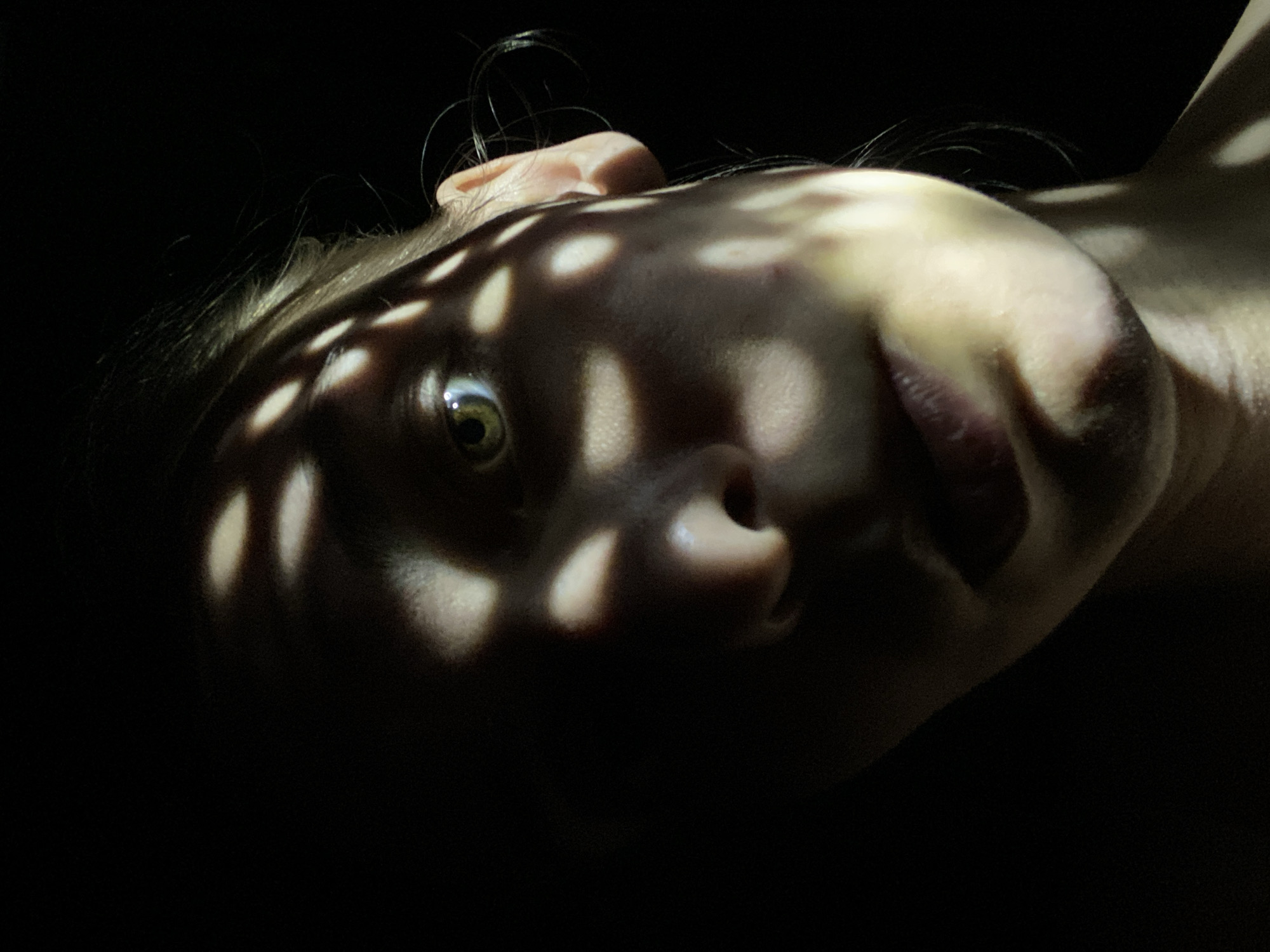 A close-up photograph captures a person's face partially illuminated by dappled light and shadow, creating a stark contrast against the dark background