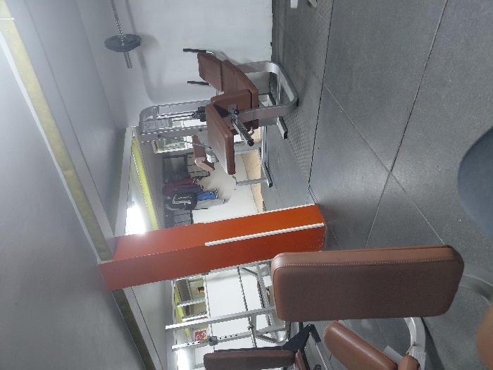 The image showcases a gym setting. Brown leather seated gym equipment stands in the foreground. In the background, various other machines can be seen, hinting at a comprehensive workout space. Bright lights illuminate the interior. The floor is tiled in shades of gray. A person can be seen in the far background.