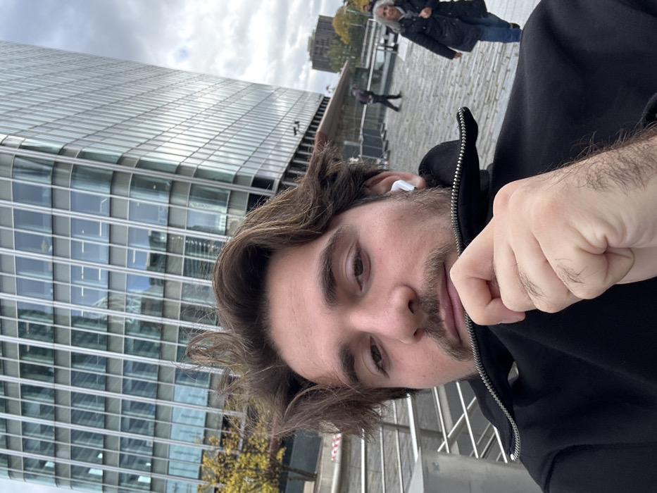 A young adult male is captured in a close-up selfie, positioned outdoors in the La Défense business district of Puteaux, France