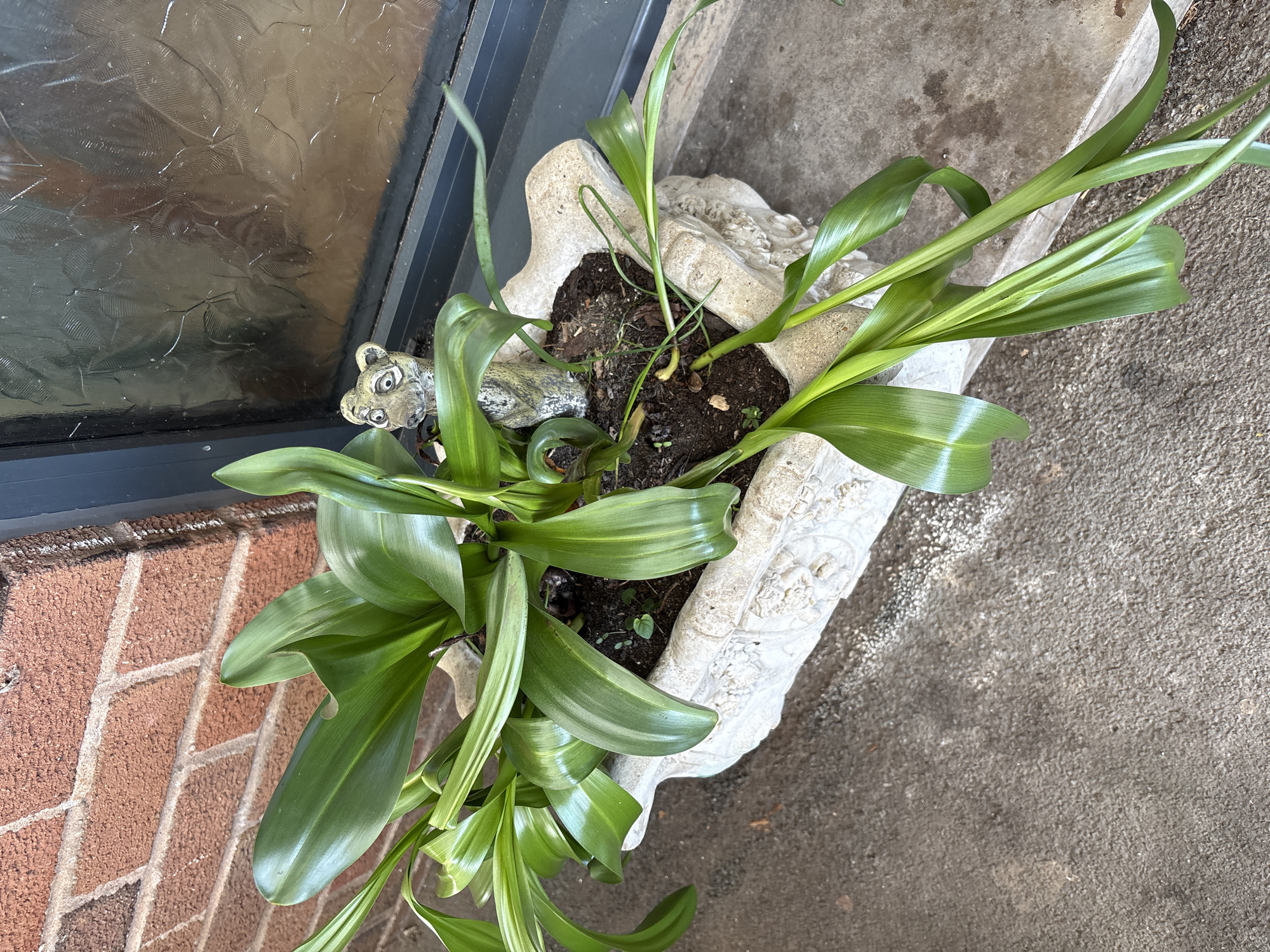 potted plant on a step next to a brick wall and a window. The plant has long, green leaves and is planted in a white, ornate pot. A small, grey ceramic figure of a lizard is nestled near the edge of the pot. The location is likely Longden, United Kingdom, based on prior context. The scene is static and there are no people visible.