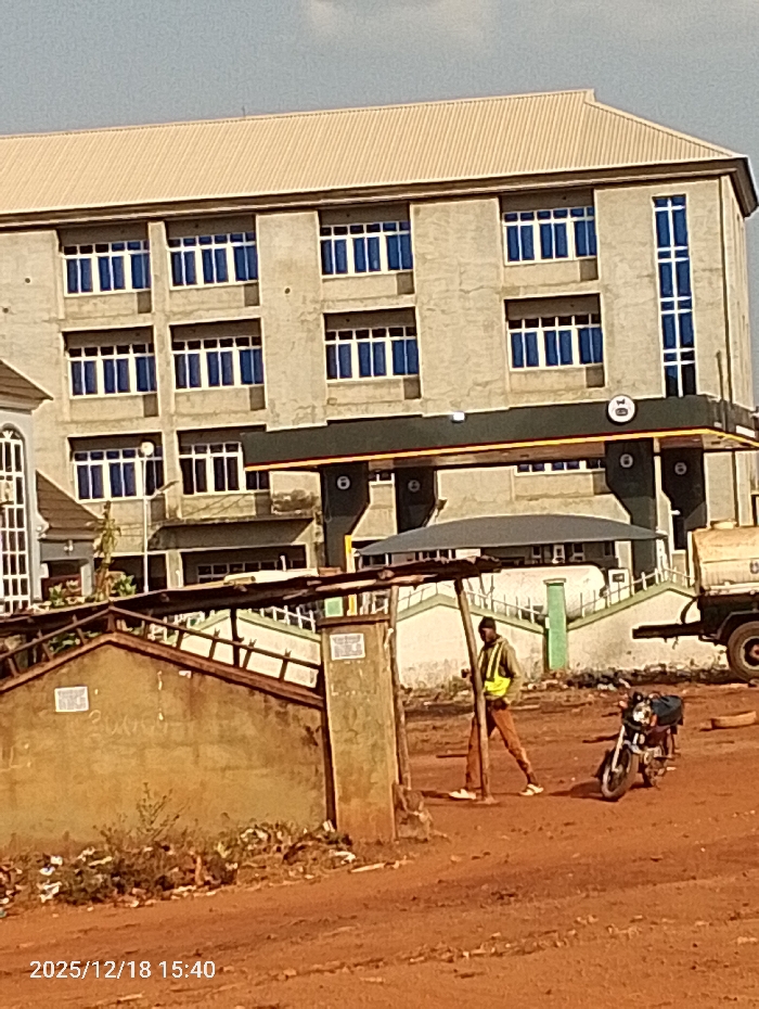 A four-story building with blue-tinted windows stands behind a gas station canopy with visible pumps