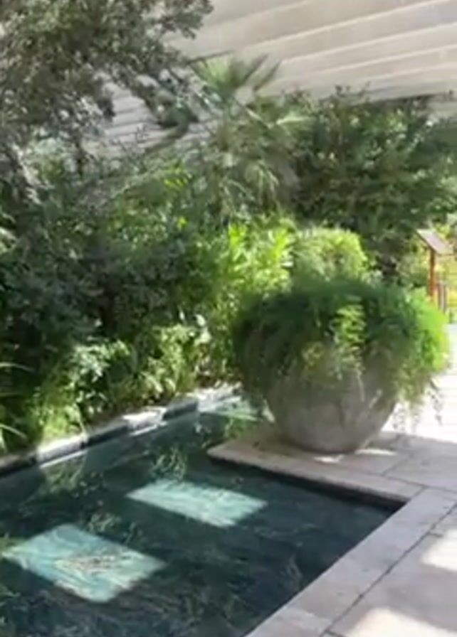 The camera pans up and backwards revealing a courtyard with a shallow channel of water running lengthwise