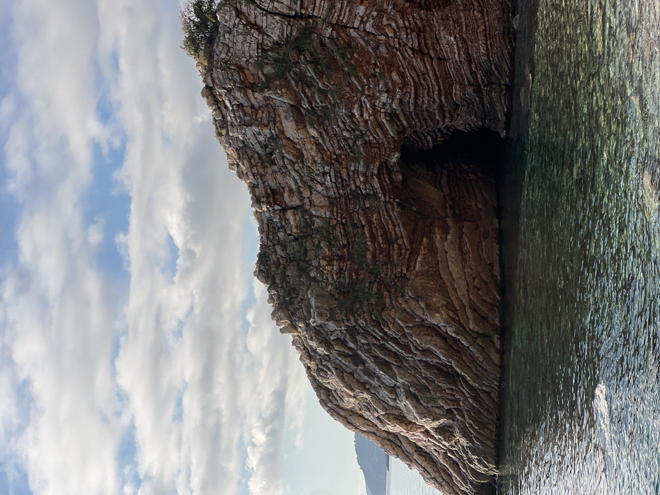 The image displays a coastal scene in Kamenovo, Montenegro, featuring a prominent natural rock formation. A large, stratified cliff of reddish-brown rock occupies the majority of the frame, showing distinct horizontal and diagonal geological layers. At the base of this cliff, directly at the water line, is a dark, arch-shaped cave entrance. The foreground is dominated by clear, tranquil water, appearing in shades of green and blue with visible surface ripples and reflections. In the upper portion of the image, the sky is partly cloudy, with scattered white clouds against a blue background. A small amount of green vegetation, including a small bush or tree, is visible on the upper ridges and surface of the rock formation. A distant landmass is faintly visible on the horizon to the far left. No individuals or man-made objects are present.