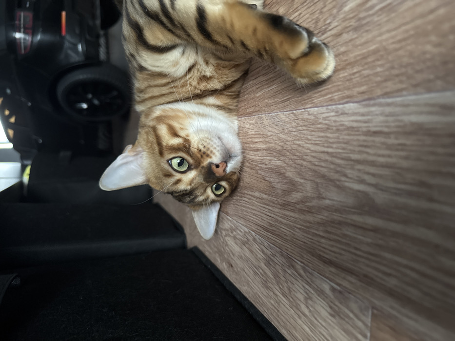 - "An indoor scene in Chusovoy, Russia, depicts a Bengal cat lying on a light brown wood-grain laminate floor" by FM-qGpE52, licensed under CC BY 4.0