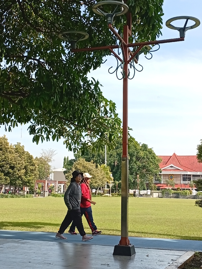 Two people walk along a paved path in a park-like setting. One wears a gray shirt and black pants; the other wears a red shirt with blue-striped pants. A unique light post stands nearby, featuring three circular lights and decorative curly metalwork. A large grassy field is visible in the background, bordered by trees and a building with a red roof and architectural details. The sky is mostly clear.