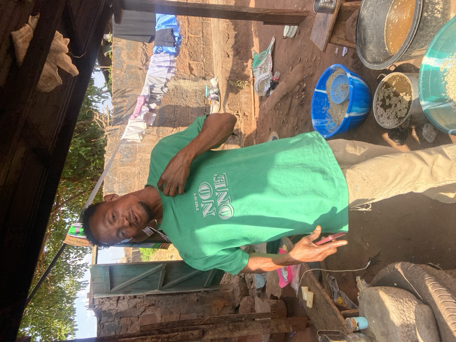The image portrays a male individual in a semi-covered outdoor area within Ankpa, Nigeria. The man, appearing to be an adult, has short dark hair and visible stubble. He wears a light green t-shirt with the phrase "TRUST NO ONE" printed in white on the chest, and light-colored, potentially stained, trousers. He stands facing the camera, with his left hand holding the collar of his t-shirt and his right hand holding a red object, possibly a mobile phone. The immediate foreground is characterized by a dark roof structure, suggesting partial shelter. The background features a reddish-brown brick or stone wall, with a dark-colored wooden door set into it on the left. A clothesline extends across the background, displaying various light-colored and blue garments hanging to dry. The ground beneath is reddish-brown dirt, containing scattered debris. Several domestic or processing items are present on the ground. These include a large blue plastic tub filled with light-colored granular material, with a smaller blue sieve containing similar material nested inside. Adjacent to it are a large black plastic tub holding a brownish liquid and a metal pot containing a brownish liquid with floating particulate matter. A wooden bench or table is positioned on the left, holding a pink plastic bowl and other small items, next to a large, grey, round stone, likely a grinding stone. A small wooden stool with a metal cup is visible on the right. The scene is brightly illuminated by sunlight.