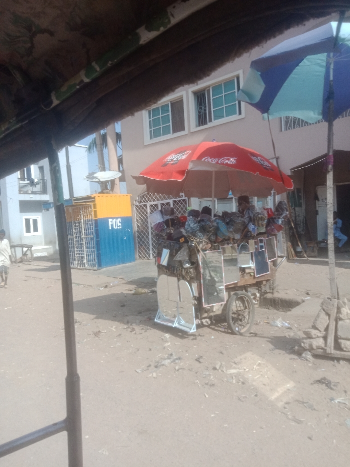The image depicts an outdoor, unpaved street scene from a low angle, framed at the top by a dark, textured canopy with visible green and white paint marks on a support bar. In the foreground, slightly right of center, a three-wheeled vending cart is stationary on dusty ground littered with debris. The cart is loaded with merchandise; its lower section displays multiple framed and unframed mirrors of various shapes (rectangular, round) while its upper section holds a dense pile of textile items, possibly hats or headwear, some individually wrapped. A red Coca-Cola branded umbrella provides shade directly over the cart. Behind the cart, a light-colored, two-story building with white-framed windows and security grilles is visible. To the immediate right of this building, a smaller, darker structure is partially visible. Further right, a blue and light blue patterned umbrella provides additional shade. A person in a blue garment is seated near an entrance on the far right. To the mid-left of the image, a large, two-toned container (yellow top, blue bottom) marked "POS" in white lettering is enclosed by a metal cage. A satellite dish is mounted above this container. To its left, a white two-story building with a balcony and laundry hanging is visible. A person in a light-colored shirt and trousers walks from left to right on the dusty ground in the mid-distance. The scene is brightly lit by natural sunlight, casting shadows. The location is Unknown, Unknown.