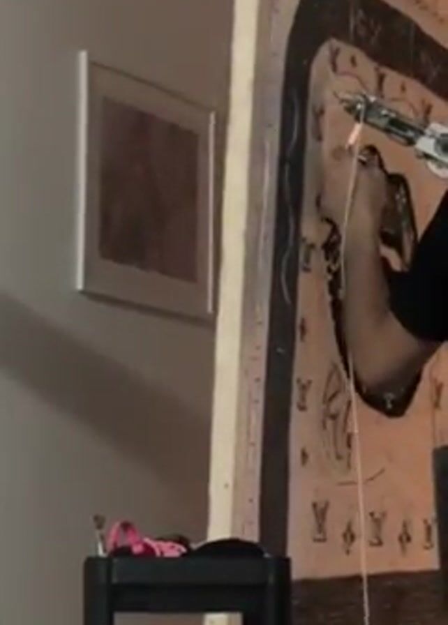 person working on a large piece of art. The artwork is mounted on a wooden frame and appears to be in progress. It features a design incorporating what seems to be a tongue and lips. The canvas has black details and is overall a light color, with repeating "LV" patterns. The artist, wearing a black shirt, is using a tool on the artwork. A black stool sits in front of the artwork, holding paintbrushes and pink fabric. A framed picture hangs on the pale wall behind the artwork.