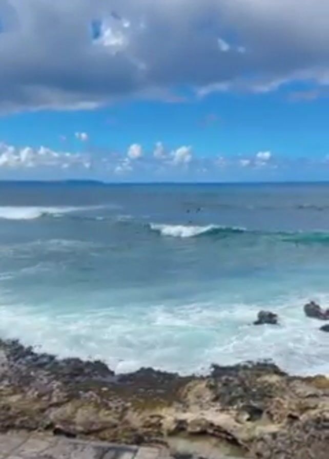 coastal scene with ocean waves crashing against a rocky shoreline. The water is a mix of light blue and turquoise. Further out in the water are a few dark shapes, possibly people surfing. The sky is blue with fluffy white clouds. In the foreground is a rocky ledge with some green vegetation and a grey concrete barrier.