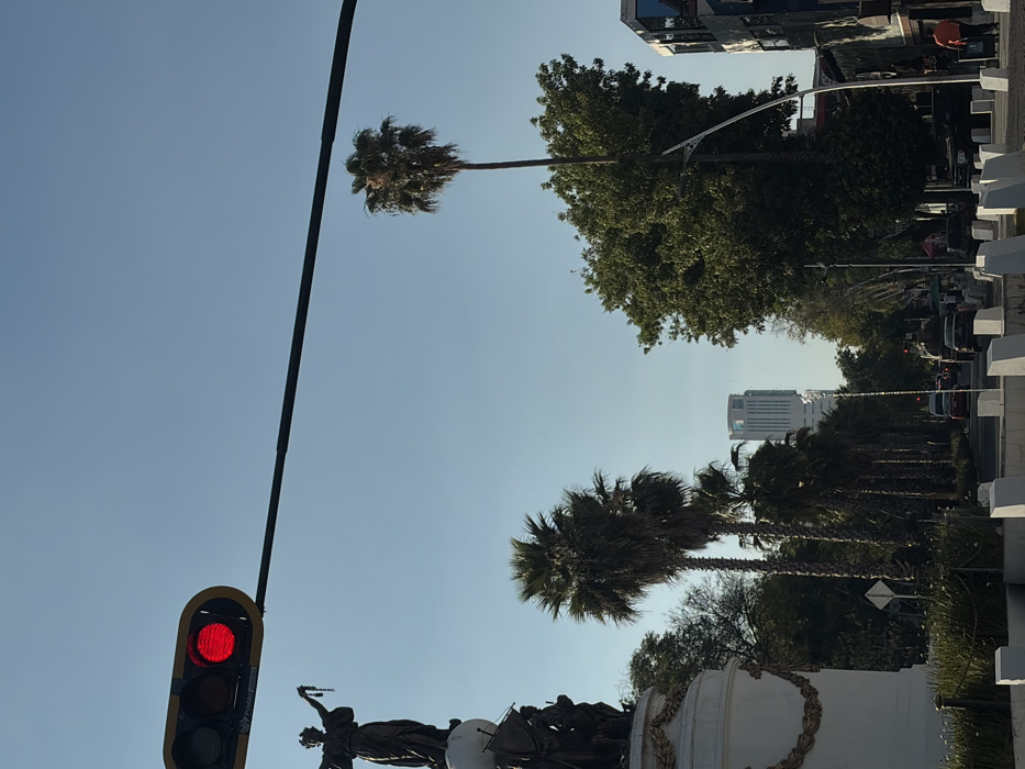 A street scene with a traffic light showing red. A statue stands on a white pedestal, while palm trees line the avenue. Further down the street, a building rises in the distance. Powerlines cut across the sky. Other trees with broader leaves are scattered along the roadside. Cars are visible on the street.