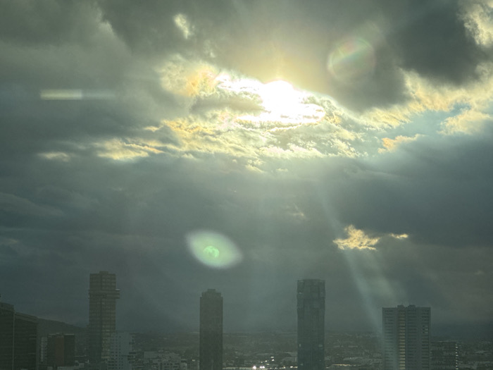 This image presents an aerial or high-vantage point view of a modern urban landscape in Heroica Puebla de Zaragoza, Mexico, dominated by a dramatic sky. The upper two-thirds of the frame are filled with heavy, dark grey and blue-grey clouds. A prominent sunburst emanates from a bright opening in the clouds in the upper left quadrant, illuminating the cloud edges with yellow and orange light. Multiple distinct rays of sunlight, or crepuscular rays, descend vertically from the clouds towards the cityscape. Three visible lens flares are present: a horizontal streak on the upper left, a faint rainbow-colored circular flare near the sunburst, and a pronounced green oval flare in the lower middle-left sky. The lower third of the image depicts a sprawling city skyline. Four prominent high-rise buildings are visible against the urban backdrop. From left to right: a tall, slender skyscraper with visible architectural details; a darker, slightly narrower skyscraper; a broad, multi-story building appearing wider than the previous two; and a shorter, wider residential-style high-rise with a textured facade. The density of the city's buildings extends into the distance, with faint mountain ranges visible on the far-left horizon. No individuals or specific actions are discernible within the frame. The environment is an urban setting under dynamic weather conditions, likely during sunrise or sunset given the angle and quality of light.