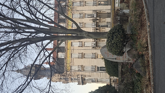 The image depicts a daytime scene on Place du Breuil in Le Puy-en-Velay, France, focused on a war memorial and the Hôtel des Postes building. In the foreground, a section of dark asphalt, likely a road or parking area, is bordered by a raised curb. Behind this, a landscaped island features a large, irregularly shaped grey stone monument inscribed with "AUX MORTS DU VELAY," "LA LIBERATION," and "1940-1945," and an engraved sword-like motif. This monument is flanked by smaller dark boulders and surrounded by various bare deciduous shrubs and a dense, dark green evergreen shrub directly in front of it. Dominating the midground is a tall, bare deciduous tree with a thick, dark brown trunk and numerous upward-reaching branches, obscuring a central portion of the background building. Behind the tree and landscaping stands a multi-story building, identified as the Hôtel des Postes, constructed of light-colored stone or stucco. Its facade features numerous windows with white frames, many equipped with white external shutters or interior blinds, and some adorned with decorative black iron railings on small balconies. The building exhibits ornate architectural details, including pilasters and cornices. A faded sign with yellow and green elements, partially reading "MAISON DE VENTE DE LA," is visible above the ground floor. The building's left corner features a rounded section with balconies, culminating in an elaborate grey, dome-shaped turret topped with a spire. A dark grey mansard roof with dormer windows and reddish chimneys is visible above the main facade. The sky above is a pale blue, suggesting an overcast day or specific lighting conditions. No individuals are visible in the scene. The bare branches of the trees and shrubs indicate a late autumn or winter setting.