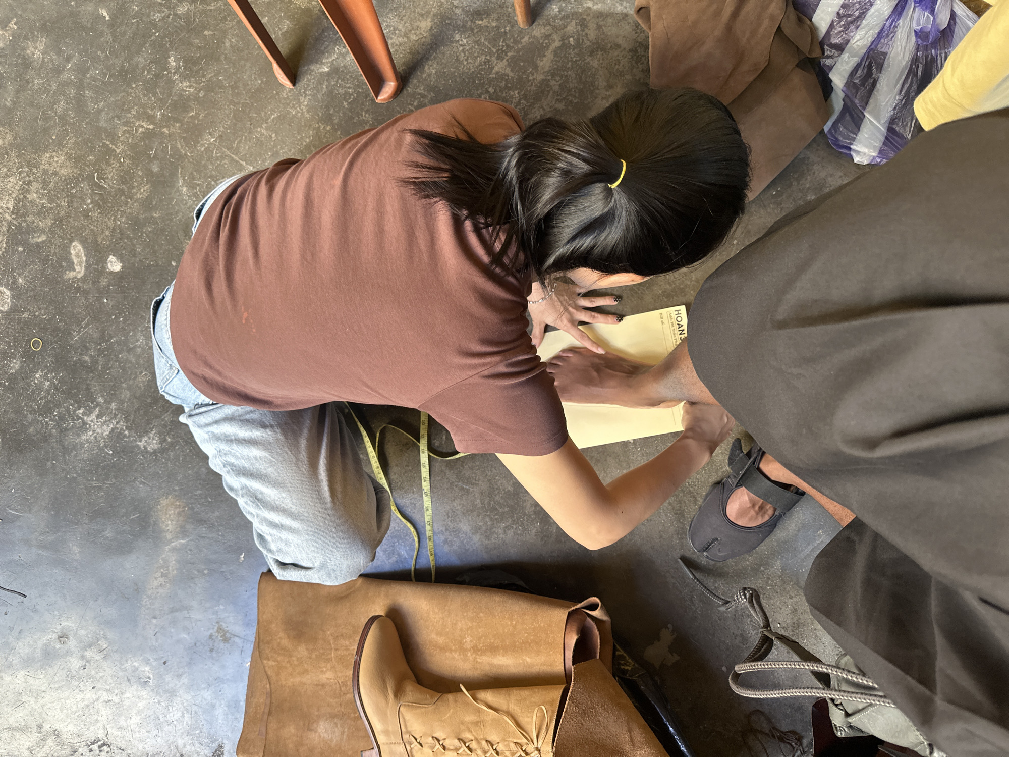 Captured from an elevated perspective, the image depicts a person engaged in what appears to be a crafting or tailoring activity. The individual, dressed in a brown t-shirt and grey sweatpants, kneels on the floor, working with paper and a measuring tape. The scene includes a brown leather boot and several pieces of leather on the floor around the individual. Adjacent to them, another person is seated, wearing a dark garment and footwear with a unique toe design. The backdrop comprises an interior space with items that suggest a workshop or crafting environment, including a chair and discarded materials. The photo was taken in Hội An Ward, Vietnam.
