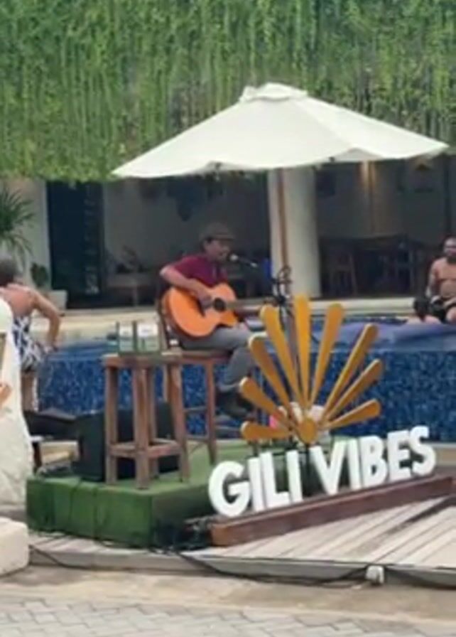 The scene unfolds outdoors, featuring a musician playing acoustic guitar and singing into a microphone while seated on a stool. He wears a hat, a burgundy shirt, and grey pants. To his left is a small table with three cans on it, and a speaker is placed on the ground. Behind him is a pool, and to his right, a large sign reads "GILI VIBES" in white letters, embellished with a sun-like design in a golden hue. People are milling around and enjoying the pool. The area is landscaped with lush greenery and plants. An umbrella provides shade. The setting appears to be a resort or outdoor bar area.
