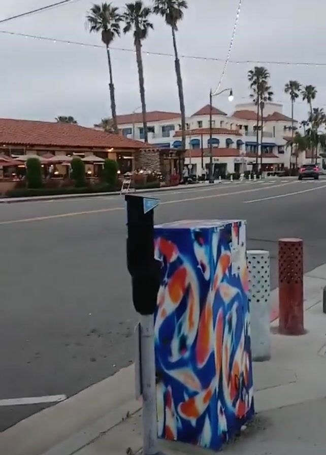 street scene in a coastal town. The sky is overcast. There are palm trees lining the street. On the left is a colorful utility box with a koi fish design. There is a parking meter next to it. In the distance are buildings with Spanish-style architecture. A "Road Work Ahead" sign is visible on the sidewalk. A few people are walking in the distance. A car drives down the street. The camera pans slowly to the right.
