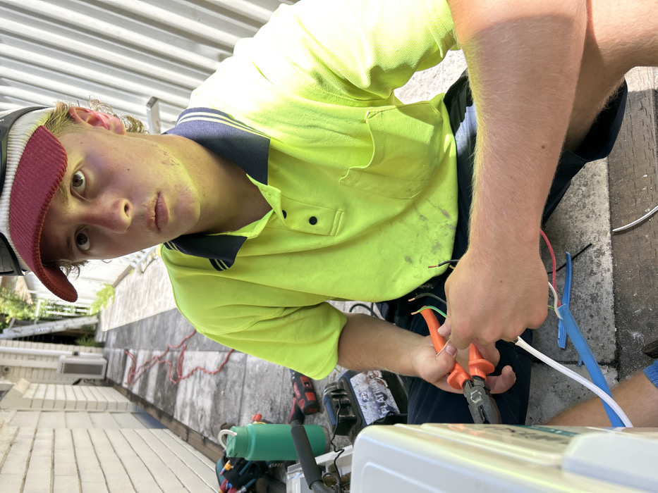 A young male electrician is working on wiring. He wears a neon yellow work shirt with dark blue accents and a baseball cap with a red bill. The electrician is holding orange-handled pliers and working with multiple wires of different colors including red, white, and blue. He is working on what appears to be an air conditioning unit or similar equipment on a rooftop or outdoor location. Tools and equipment are visible around him.
