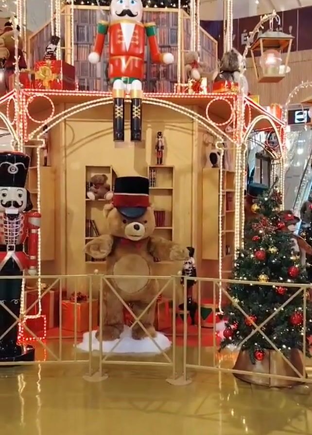 Christmas display inside a shopping mall. The display features a large wooden structure with a shelf filled with teddy bears, toy soldiers, and other Christmas decorations. A large nutcracker statue is on top of the structure and a smaller nutcracker stands to the left of the structure. A teddy bear with a top hat is in front of the shelf. A Christmas tree with ornaments and lights stands to the right of the structure. The floor is shiny gold. The display is surrounded by a gold metal fence. People can be seen walking in the background.