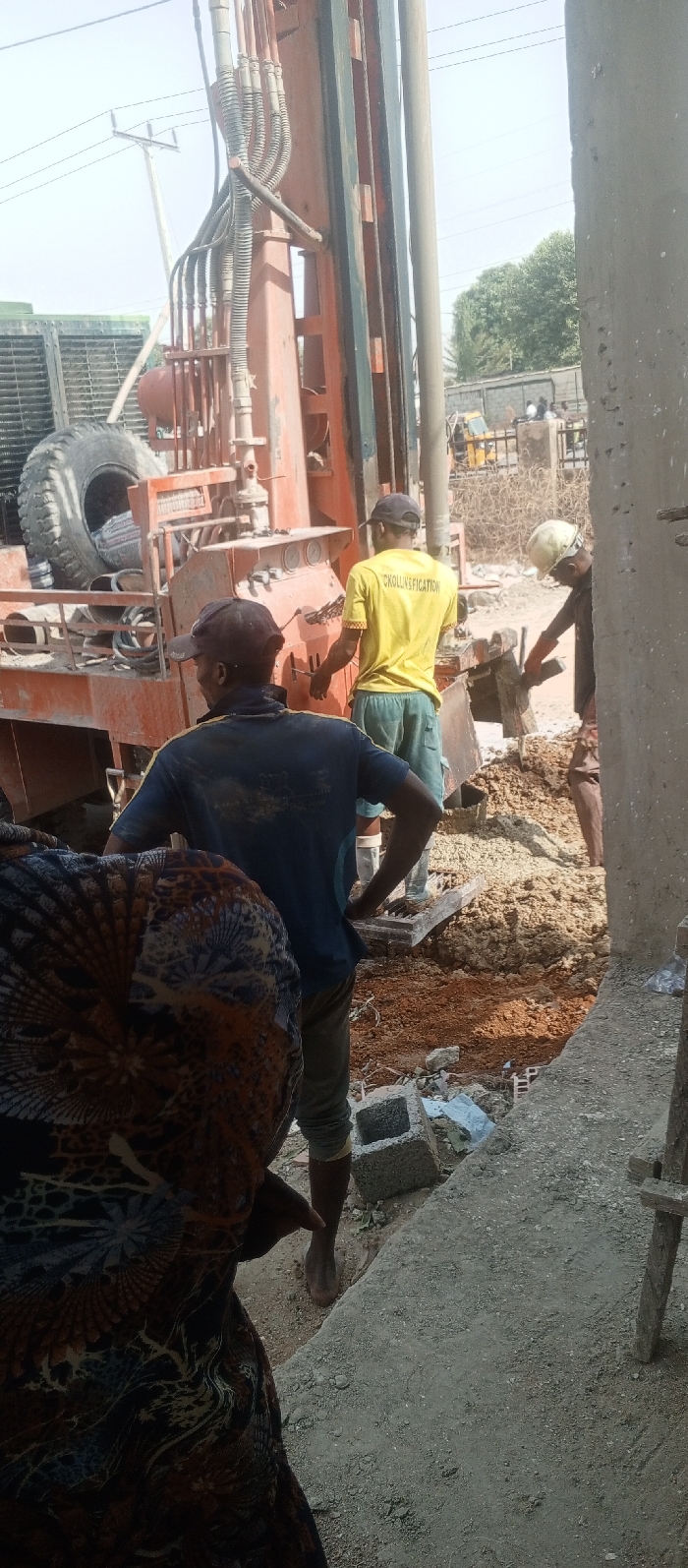 This image depicts an active drilling operation in Dushepe, Nigeria, under a bright, clear sky