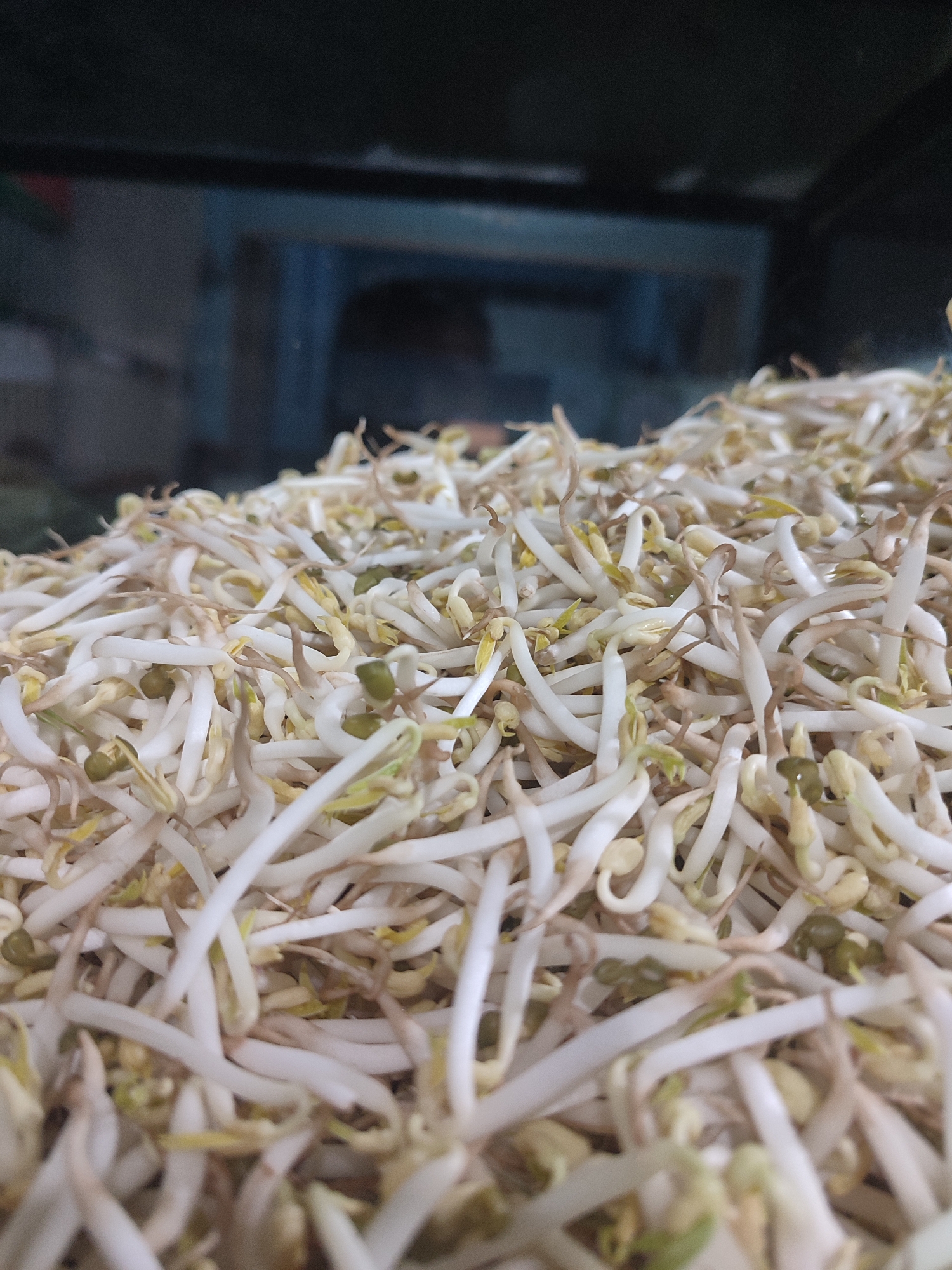 A close-up shows a large pile of mung bean sprouts