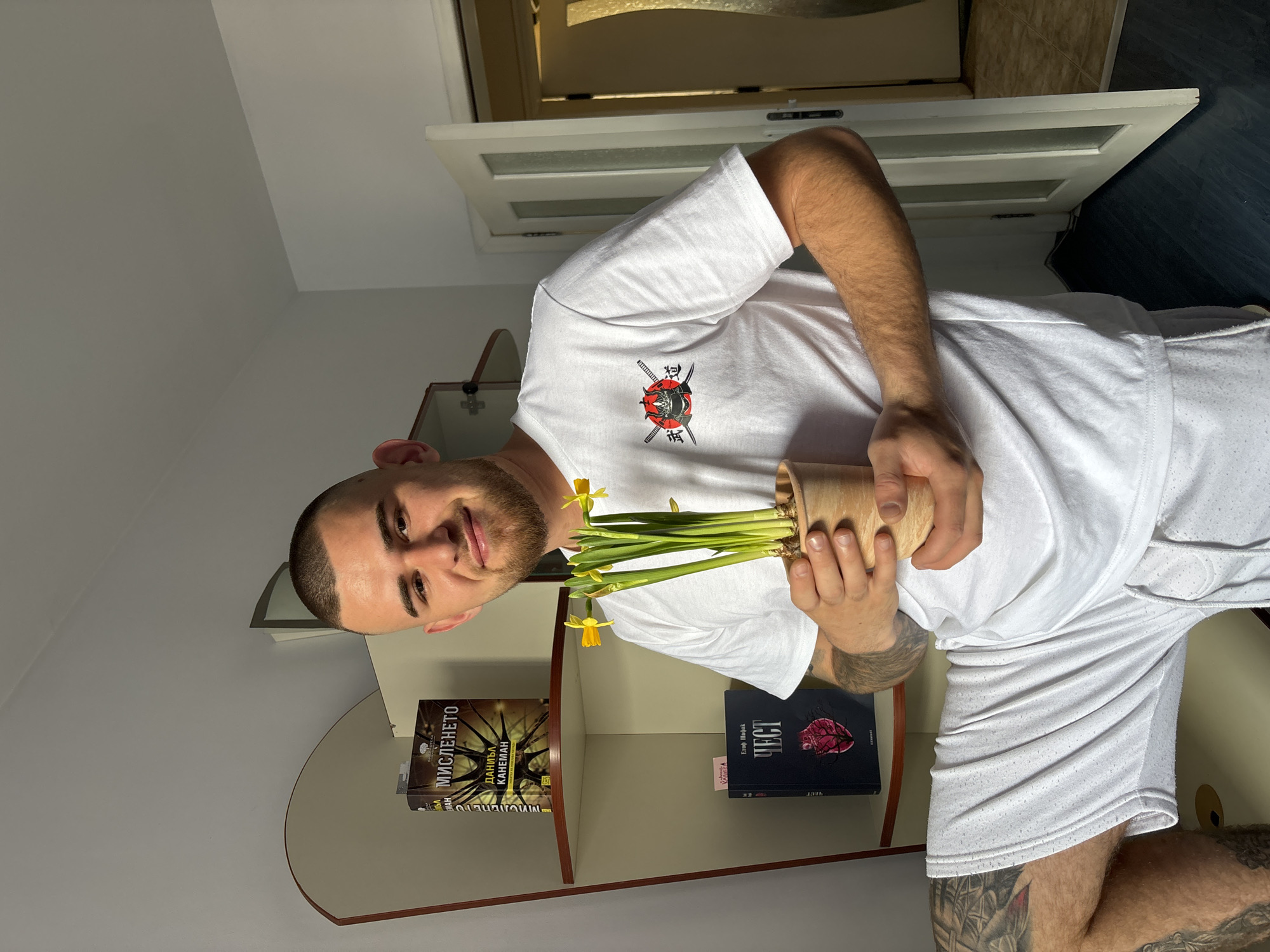 A man indoors is holding a potted plant with yellow flowers. He is wearing a white t-shirt with a logo and white shorts. Behind him is a white bookshelf with two books. The location is possibly in Varna, Bulgaria.