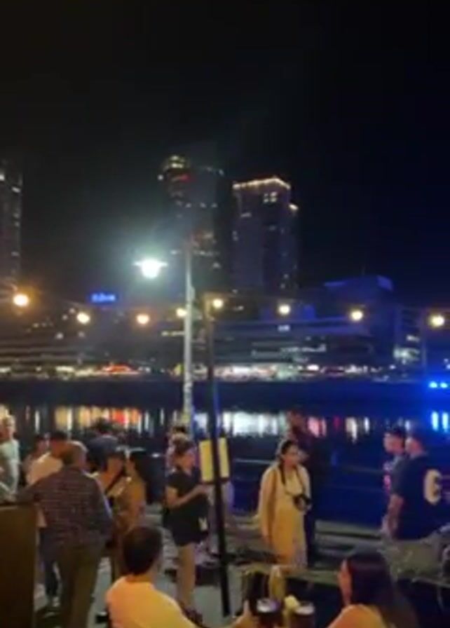 n outdoor scene at night, possibly a restaurant or bar area, with people milling about and sitting at tables. In the background, there's a waterfront with city buildings illuminated in the distance. The buildings reflect in the water. There is also a brightly illuminated blue suspension bridge in the distance. The overall atmosphere seems lively and social.
