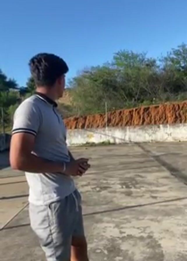 A young man stands on a concrete platform, wearing a gray polo shirt with dark collar trim, gray shorts, and white shoes. He turns to his right, bends his knees, and throws an object out of frame. He then rights himself and continues looking in the same direction. The sky is blue, and a low, brushy hillside extends along the background. There are thin white poles sticking up from the top of a low wall in the background.