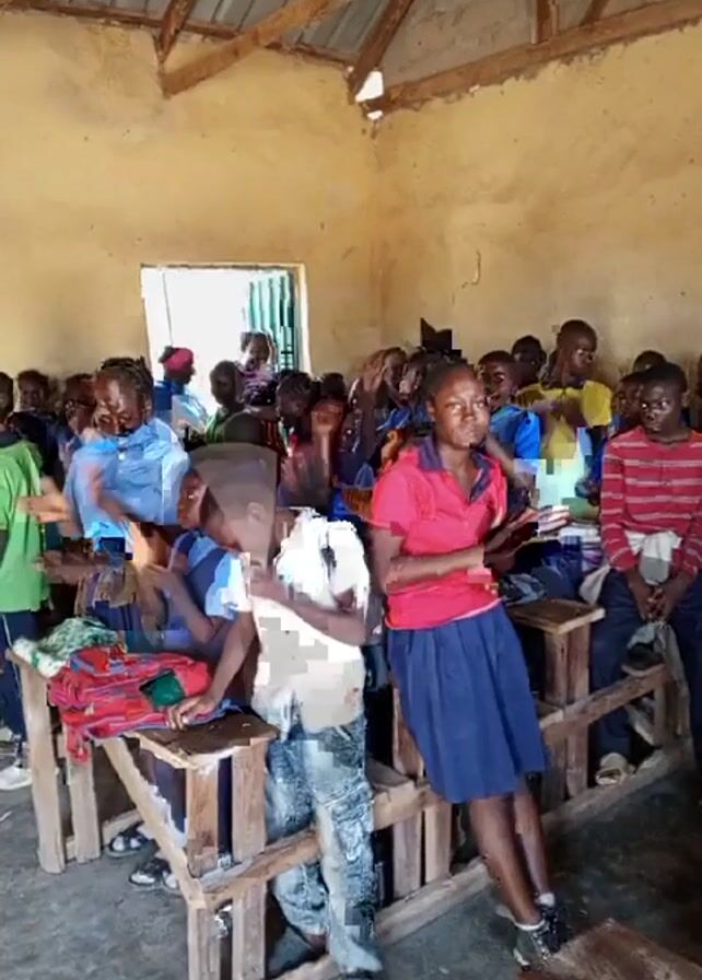 crowded classroom with students in uniform. The room has a simple construction with exposed wooden beams as a ceiling. Students are clapping and appear to be engaged in an activity or a song. They are standing near or sitting on wooden desks. A girl in a red shirt and blue skirt is prominently visible in the foreground. The room is lit by natural light from a window.