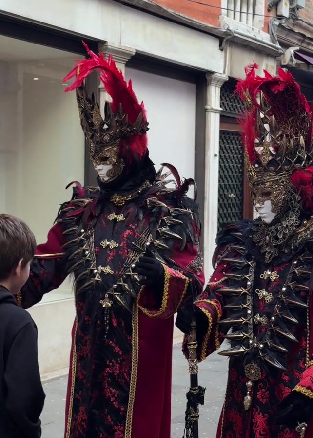 two costumed individuals interacting with children. The costumed individuals are wearing elaborate red and black costumes with feathered headpieces and ornate masks. They also have black gloves and gold accents on their outfits. The children, two boys and a girl, are standing in front of them, seemingly admiring their costumes. The scene takes place on a city street, likely during a carnival or festival. There's a shop window in the background. The mood seems lighthearted and festive.