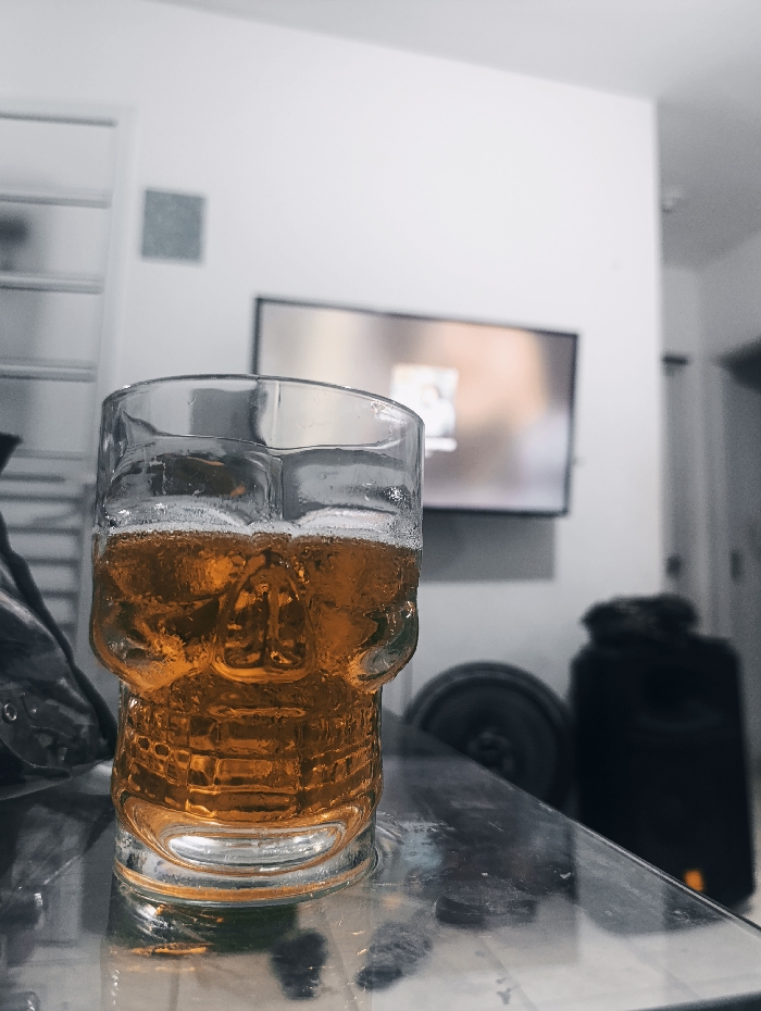 A skull-shaped glass filled with amber-colored liquid sits on a reflective surface. The background is predominantly grayscale, featuring a TV, shelving, a speaker, and a doorway. The beer is in color, and the skull features are visible in the glass. The surrounding objects are blurred, giving prominence to the beer glass.