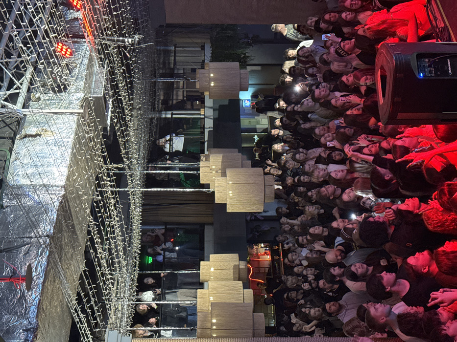 The image depicts an indoor venue identified as Jungle at Ulitsa Sverdlova, 35a, Tolyatti, Samara Oblast, Russia. A large crowd of approximately 100-150 individuals, predominantly young adults, occupies the main floor area. Many individuals are looking forward, with several holding smartphones aloft, indicating potential recording or photography. The crowd is densely packed, with varying casual attire. Above the main floor, a balcony level features a transparent barrier behind which a smaller group of people is observing the scene. The ceiling structure is exposed, featuring metallic foil-covered ductwork, an extensive network of white string lights, and several multi-tiered rectangular pendant light fixtures hanging at different heights. Red stage lighting illuminates portions of the crowd on the right side and a large black Turbosound speaker positioned in the foreground. A green neon sign is visible on the upper level in the background. The overall environment suggests a live performance, concert, or club event.