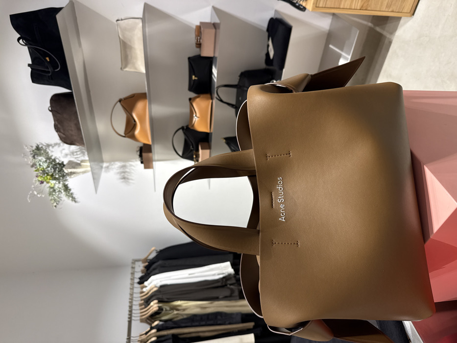 The image displays the interior of an Acne Studios retail boutique, inferred to be located in Tel Aviv, Israel. The central subject is a medium-sized, tan leather tote bag with two top handles and distinctive side knot details, bearing the "Acne Studios" brand name in silver text on its front surface. This bag rests on a pink, faceted geometric display pedestal in the foreground. In the midground, to the right, a series of three silver-colored wall-mounted shelves exhibit a collection of leather handbags in various styles and colors, including black, dark brown, tan, and cream, interspersed with small rectangular display blocks. To the left, a chrome clothing rack holds an assortment of garments, predominantly in dark, neutral tones, on wooden hangers. A floral arrangement in a clear vase is visible on a higher shelf on the left. The environment features white walls and illuminated product displays. No individuals are present in the scene.