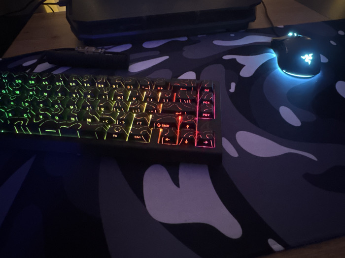 The image displays a close-up, elevated view of a computer desk setup in Stara Zagora, Bulgaria, under low ambient light. A large, dark-toned mouse pad with an abstract grey, white, and purple fluid-like pattern covers the desk surface. On the left, a compact mechanical keyboard with illuminated RGB backlighting transitions from green on the left keys to yellow, orange, and red on the right. The keycaps feature transparent legends and subtle surface patterns. To the right, a black Razer gaming mouse is visible, emitting a blue light from its scroll wheel and base, illuminating the mouse pad beneath it. A black cylindrical object, possibly a vape pen or a small electronic device, is positioned behind the keyboard. In the background, a dark, rectangular electronic device, potentially a speaker or monitor stand, is partially visible on a light-colored wooden desk surface. No individuals or active interactions are depicted.