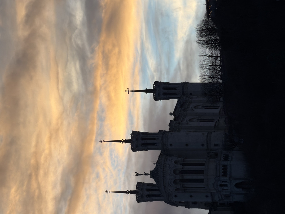 Basilica of Notre-Dame de Fourvière in Lyon, France, against a sunset sky