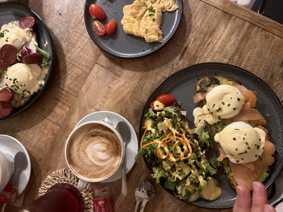 - "The image captures a breakfast or brunch spread laid out on a light brown wooden table with a herringbone pattern, indicating an indoor cafe or restaurant setting" by FM-4GKkh1, licensed under CC BY 4.0