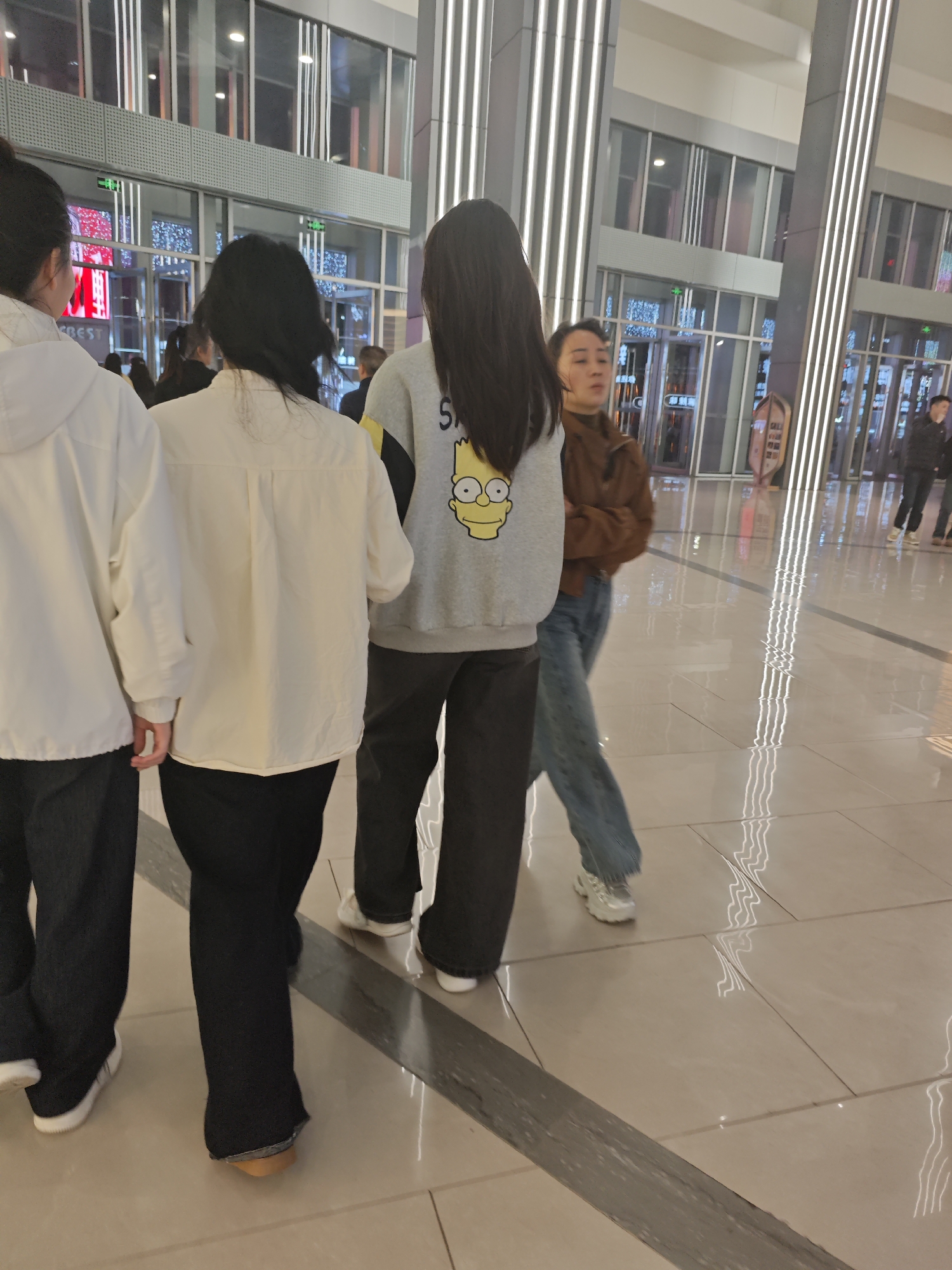 Three people are walking inside a large indoor space. The person in the middle is wearing a cream-colored, button-down shirt and black pants. The person to the left is wearing a white hooded jacket and dark blue jeans. The person to the right is wearing a gray sweatshirt with a yellow cartoon character and black pants. In the background, there are glass windows and doors, and tall vertical light fixtures. Other people are walking in the background. The scene appears to be inside a shopping mall or large public building. This photo was taken in Liangjiang, China.