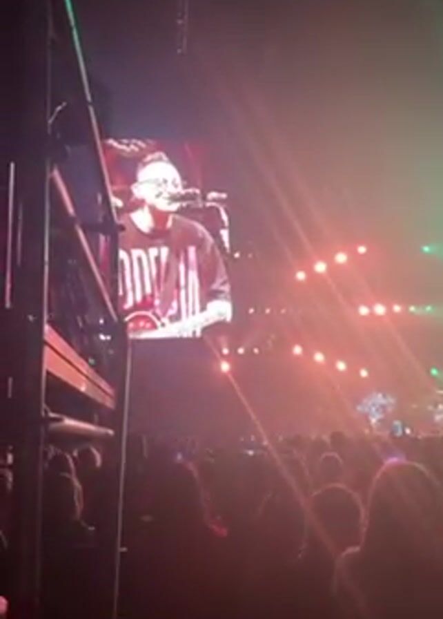 concert with a large crowd. On a big screen, a man is singing and playing guitar. He wears glasses and a black shirt with pink lettering. The stage is illuminated with bright, multicolored lights. The audience holds up phones to record. Steel scaffolding is partially visible on the left side of the screen.