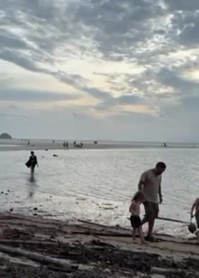 A father is walking with his two small children on a beach. He is holding the hand of one child, and the other is walking alongside him. The beach is wide and flat, and there are other people walking in the distance. The sky is cloudy, but the sun is still shining through. There are logs and debris on the beach near the father and children.