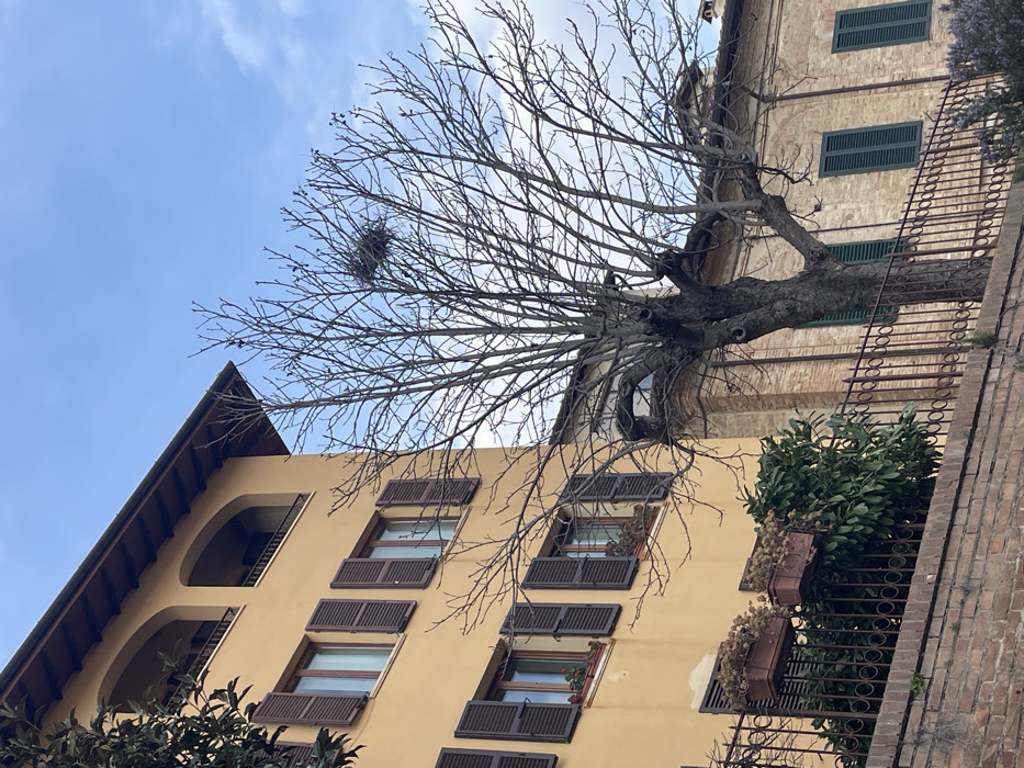 The image depicts a street scene in Siena, Italy, under a partly cloudy blue sky. In the foreground, a brick retaining wall is topped with a black wrought-iron fence featuring circular embellishments. Behind this fence, on the left, a multi-story building with a pale yellow stucco facade is visible. This building features multiple rectangular windows fitted with dark brown wooden louvered shutters, most of which are open. Several windows display brown planter boxes, some containing red flowers, others dried vegetation. The top floor of the yellow building includes two arched, recessed loggias or balconies with dark railings, beneath a dark brown wooden roof overhang. To the right of the yellow building, a large, leafless deciduous tree with a dark, gnarled trunk and bare branches stands prominently in the mid-ground. A substantial bird's nest is clearly visible high within its upper branches. Behind the tree and to the right, a second, lighter brick building is partially observed, featuring at least two windows with closed dark green louvered shutters. Lush green foliage is present behind the wrought-iron fence, in front of the lower section of the yellow building, alongside additional planters with dried plants. No individuals are present in the scene.